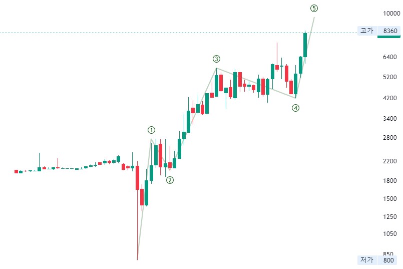 레이크머티리얼즈는 길었던 우측횡보 조정을 마치고 2020년 3월부터 현재까지 상승 임펄스 파동의 모양을 그려주고 있습니다.