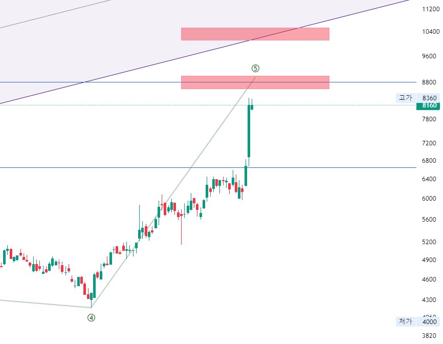 조정 타겟점은 1파 길이의 0.618배 구간과 임펄스 가속채널 구간 하단을 예측할 수 있습니다. 가격대로 보자면 1차 조정구간은 8800원 2차 조정 예측 구간은 10200원 정도에서 가격 조정이 이뤄질 것으로 생각하고 있습니다.